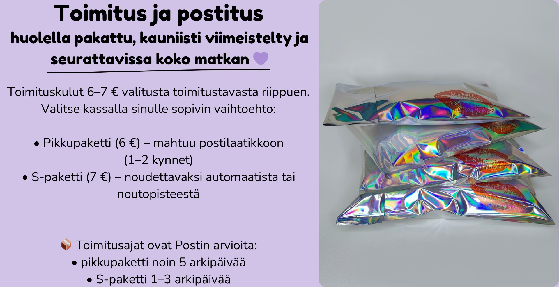 Saat sähköpostiisi lähetystunnuksen, jolla voit seurata tilaustasi. Jos haluat tietyn noutopisteen, lisää se kassalla lisätietoihin.