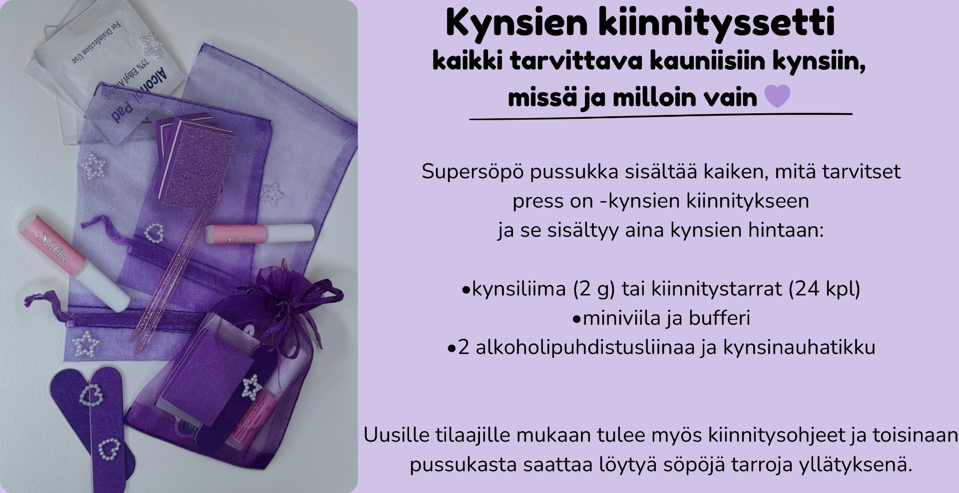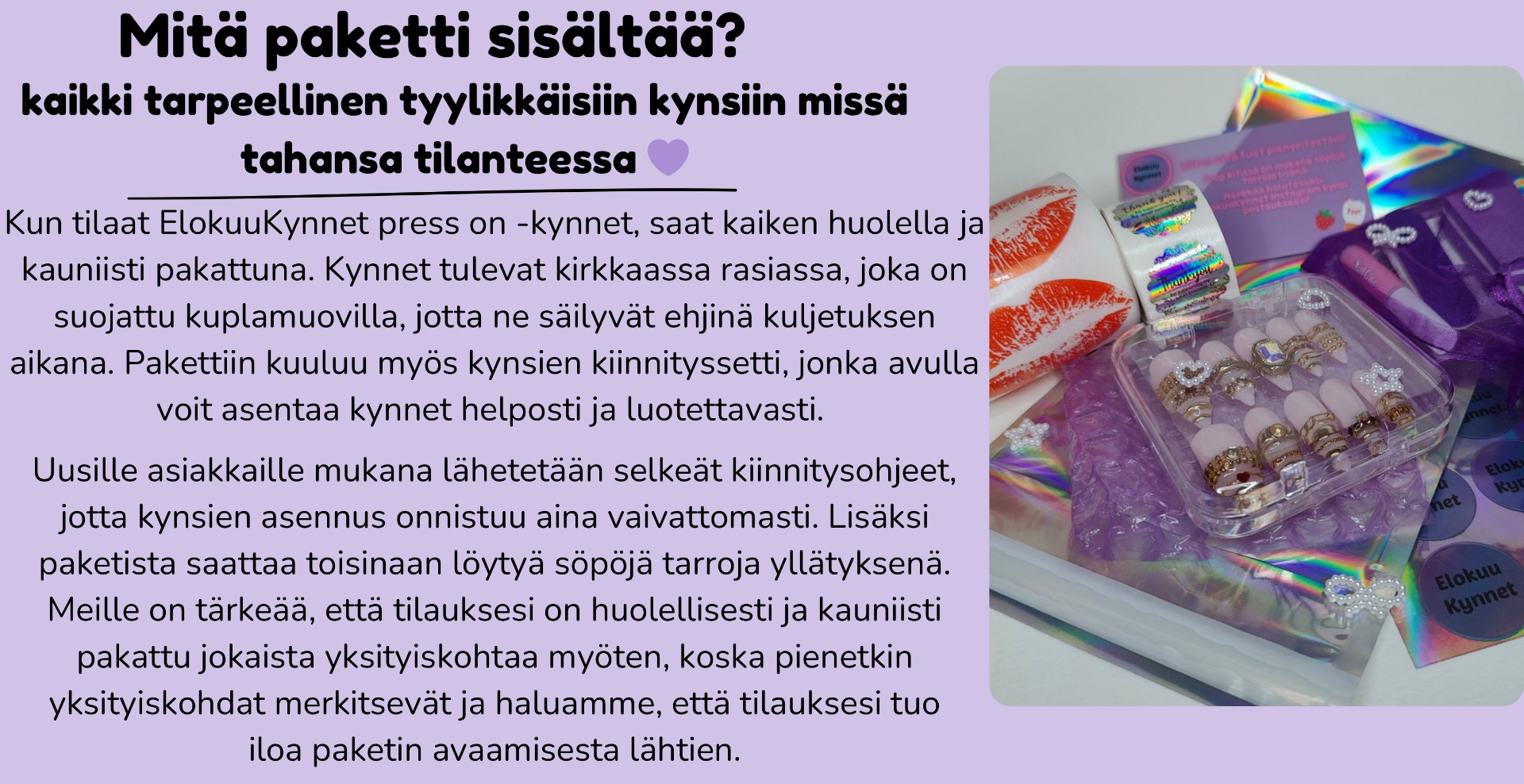Jokainen kynsipari valmistetaan käsin alusta loppuun huolella ja ammattitaidolla. Vahva pohjageeli tekee kynsistä pitkäikäiset ja kauniit, mutta ne eivät ole liian paksut. Kynnet pysyvät kauniina pitkään, eivät katkea helposti ja ne on helppo poistaa hellävaraisesti omilta kynsiltä. Hinta sisältää kynsien kiinnityssetin, joten voit asentaa kynnet helposti ja pitkäkestoisesti kotona.