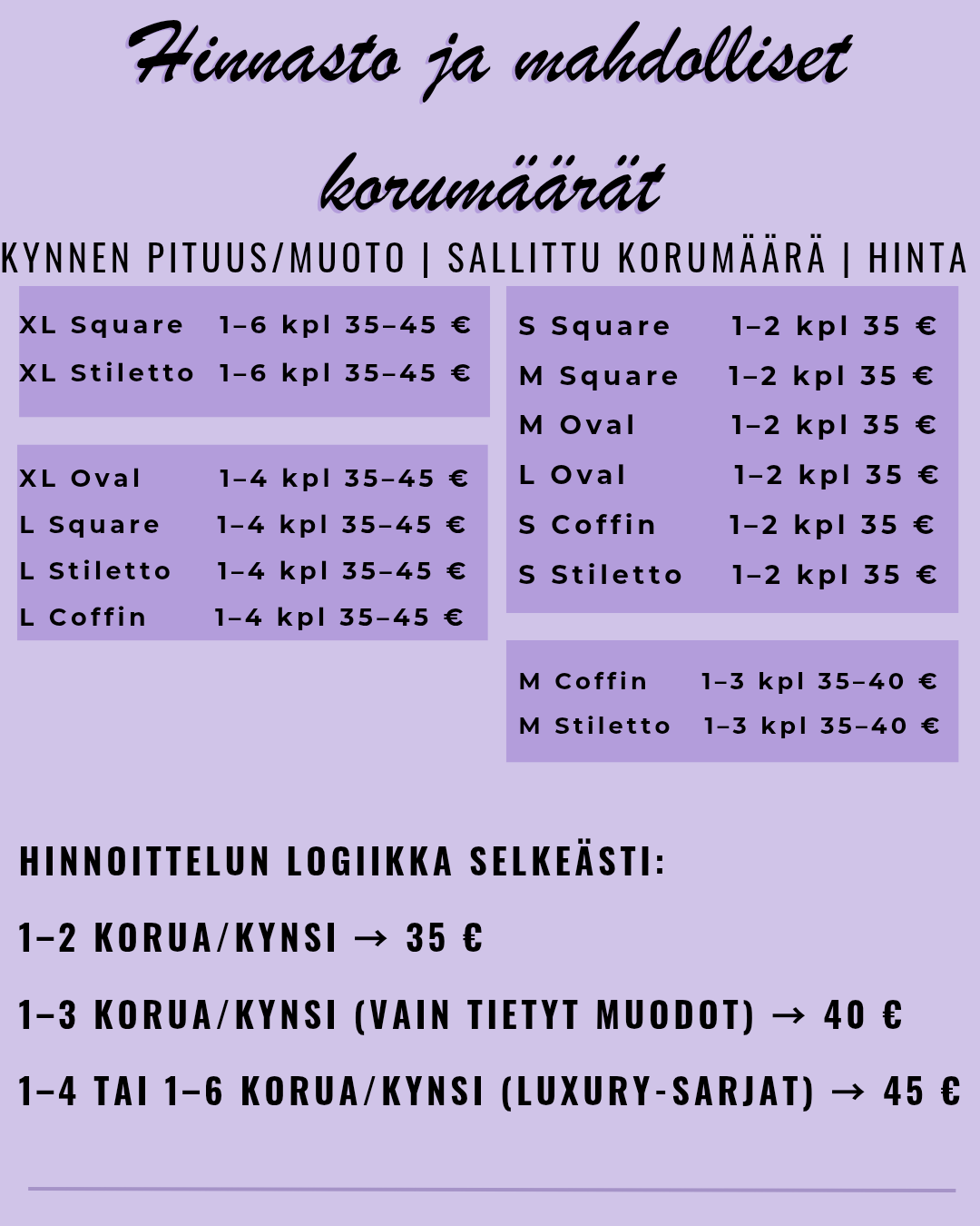 Muistathan, että mitään ei ole pakko ilmoittaa – silloin kynsien suunnittelu ja toteutus on minun käsissäni, ja voit silti olla varma, että saat upean ja mieleisesi setin.