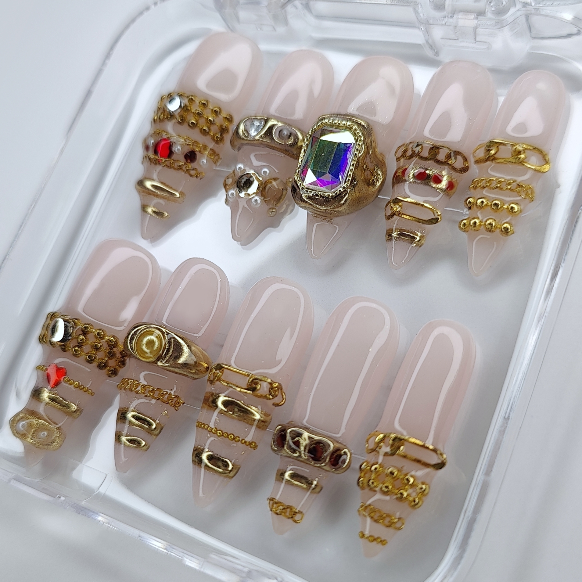 Nimensä mukaisesti nämä press-on -kynnet ovat kuin pieniä koruja kynsissäsi. Idea syntyi trendin innoittamana luoda kynsiin yksityiskohtaisia ja näyttäviä koristeita: ketjuja, 3D-geelimassalla tehtyjä sormuksia ja rannekoruja, jotka tekevät jokaisesta kynnestä taideteoksen.
