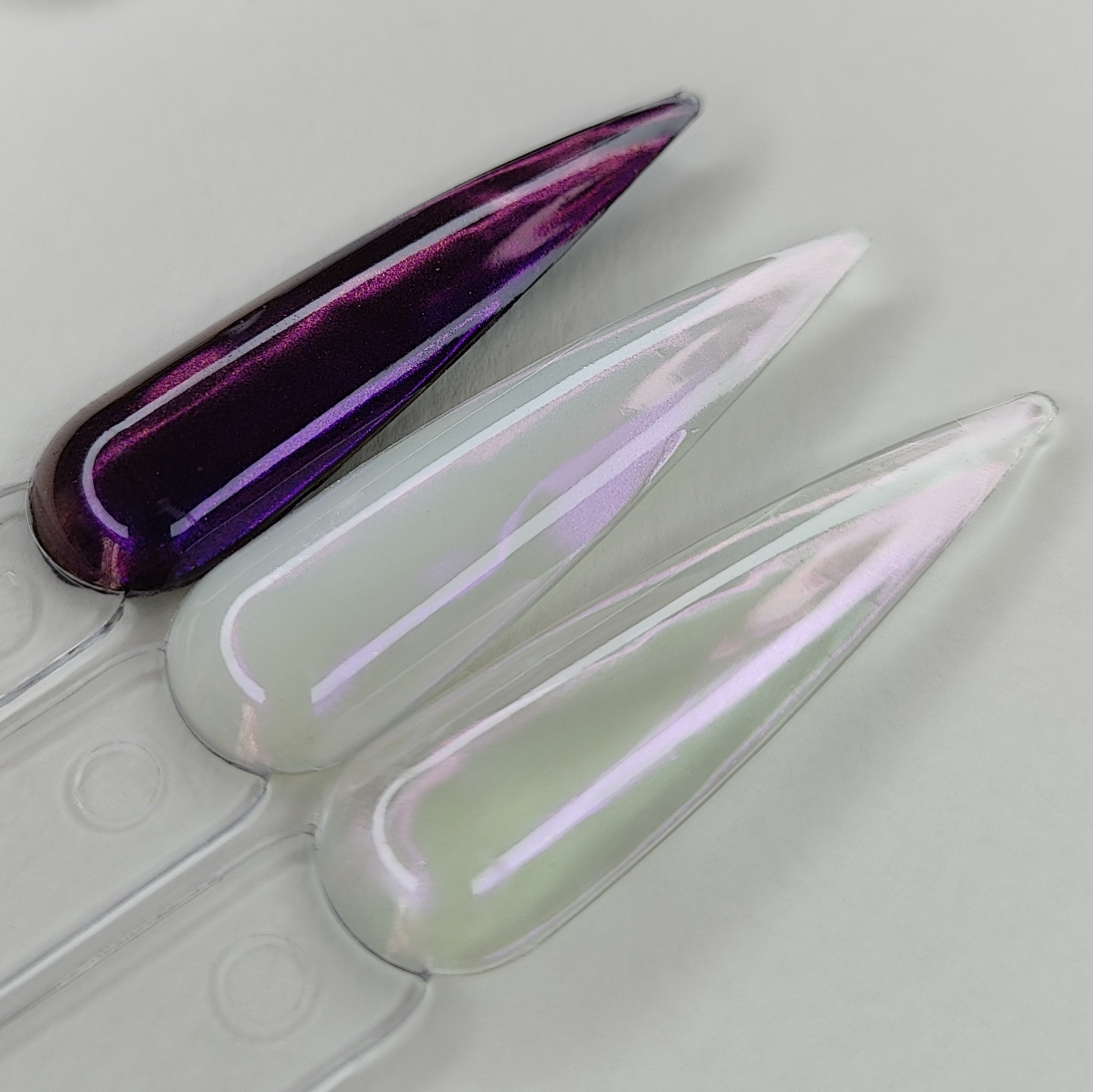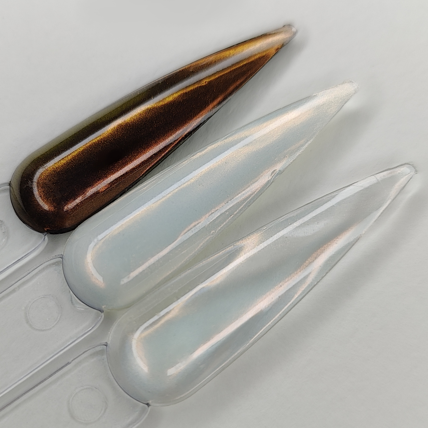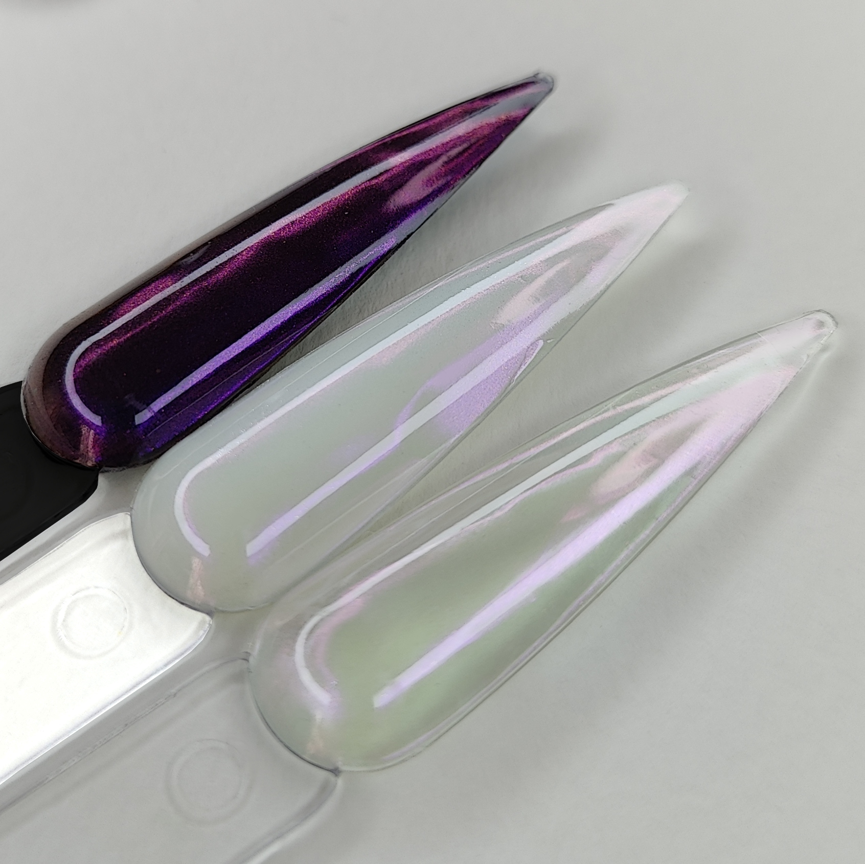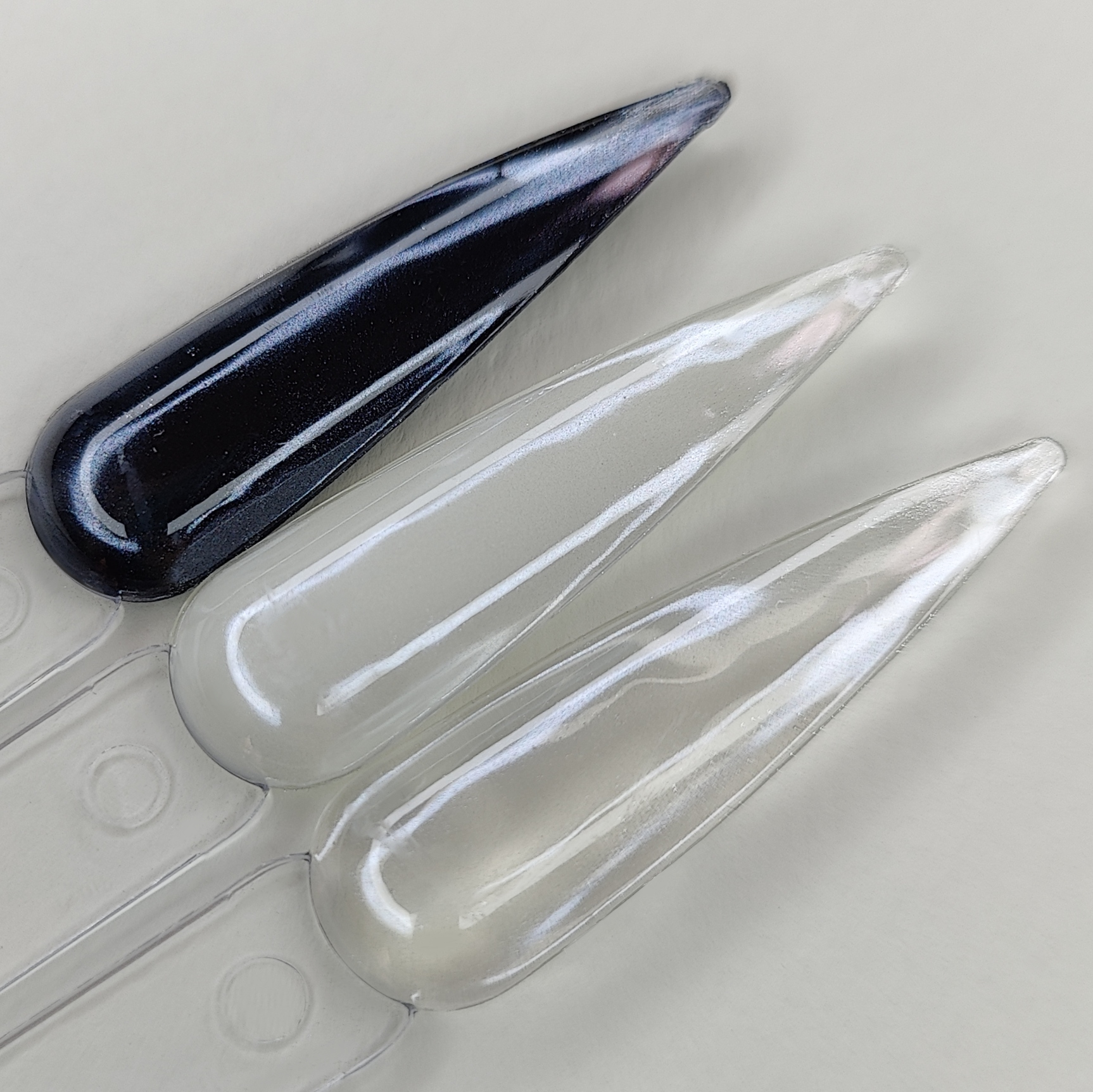 Helmiäispulveri levitetään valitsemasi sävyn päälle. Se ei peitä väriä kokonaan, vaan muuttaa sen sävyä ja tuo siihen hohtavan, valoa ja väriä heijastavan pinnan. Tumman värin päällä efekti on syvempi ja voimakkaampi ja vaalean päällä lopputulos on pehmeämpi ja hempeämpi. Kirkkaan päällä efekti on hyvin kevyt ja läpikuultava. Kuvassa näkyy sama helmiäispinnoite kolmella eri pohjalla: musta, valkoinen ja kirkas. Tämä auttaa hahmottamaan, miten lopputulos voi vaihdella eri sävyjen päällä.